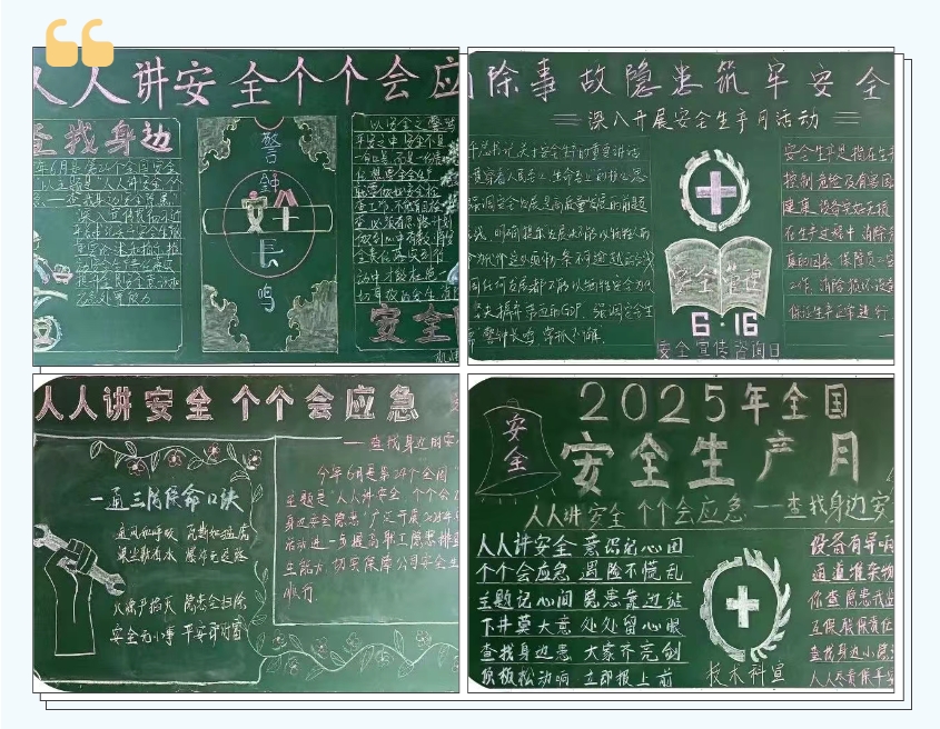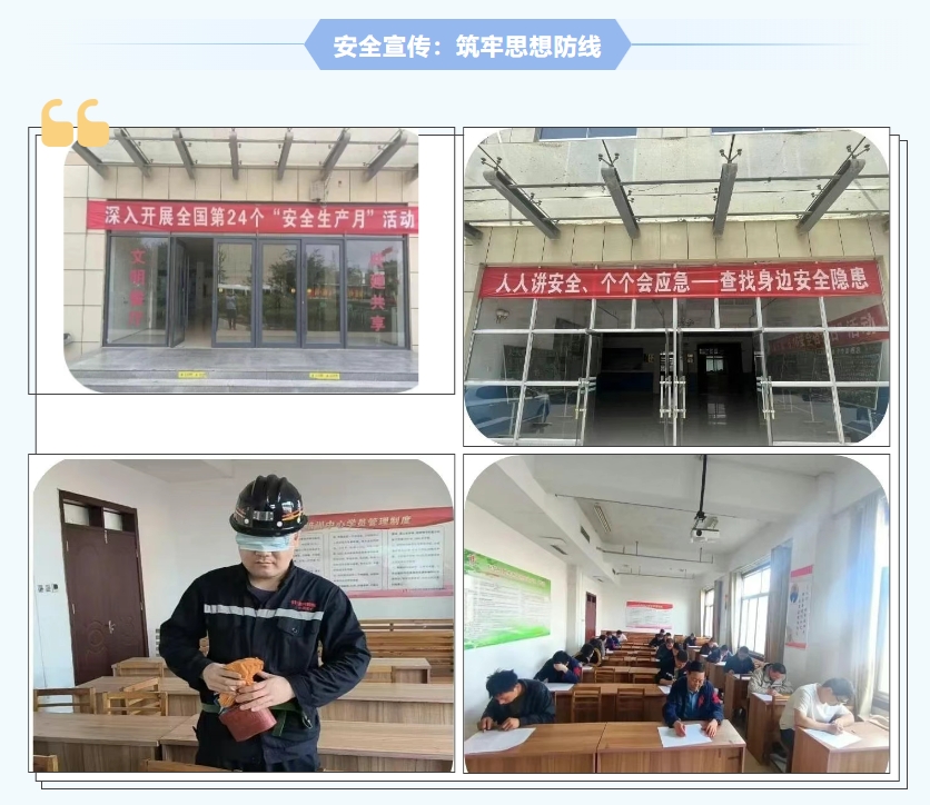 为营造“安全生产月”活动的良好氛围,我矿在办公楼、掘进楼、餐厅、入井走廊等显著位置悬挂了“安全生产月”活动条幅,组织“五科”专业科室绘制宣传板报,广泛宣传,进一步引起全体干部职工对安全生产的广泛关注和高度重视,并常态化进行自救器盲戴培训、“六必知”知识考核,营造良好学习氛围。